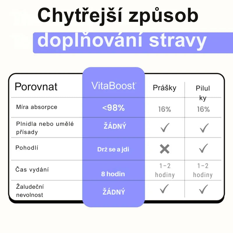 Mnoho tablet a prášků se správně nevstřebává. VitaBoost™ je navržen pro až 5× lepší vstřebávání, aby tělo mohlo živiny skutečně využít.