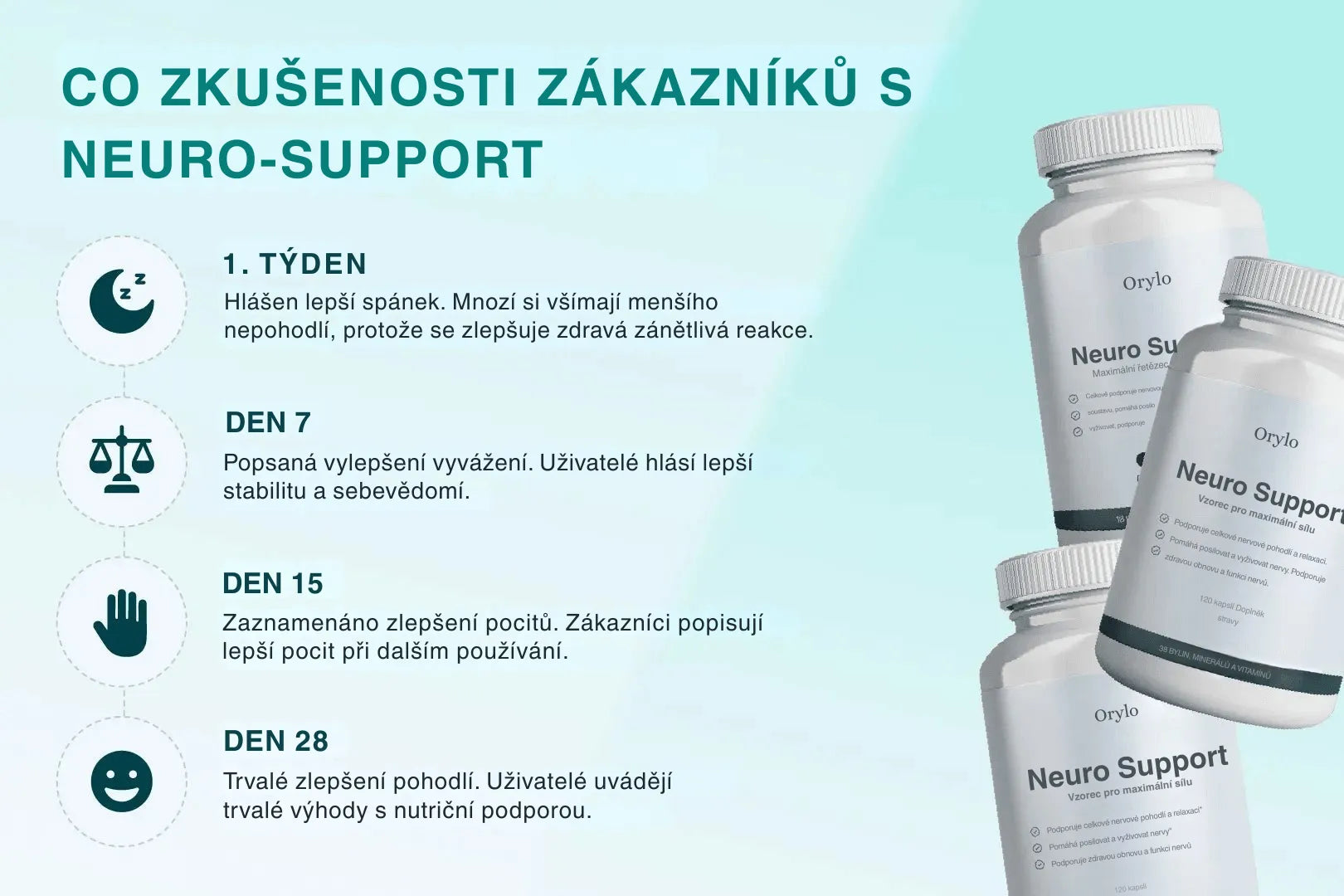 Začala jsem užívat Neuro Support na podporu rovnováhy a nervového diskomfortu. Výsledky se dostavily postupně, ale jasně. Nejprve se zlepšil spánek, poté jsem cítila větší stabilitu a jistotu při chůzi. Mám pocit, že jde o stabilní dlouhodobou podporu, nikoli jen dočasné řešení.