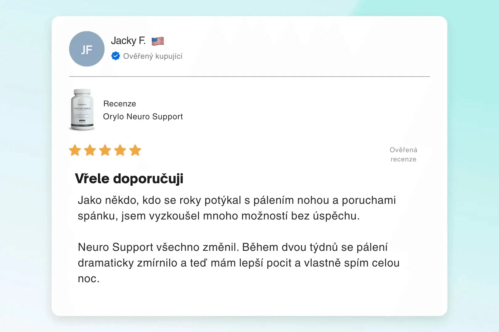 Po několika týdnech užívání Neuro Support jsem zaznamenala skutečné zlepšení spánku a každodenního komfortu. Neustálé brnění v nohou se snížilo a pohyb byl snazší. Nejlepší je, že jsem neměla žádné nepohodlí ani vedlejší účinky.