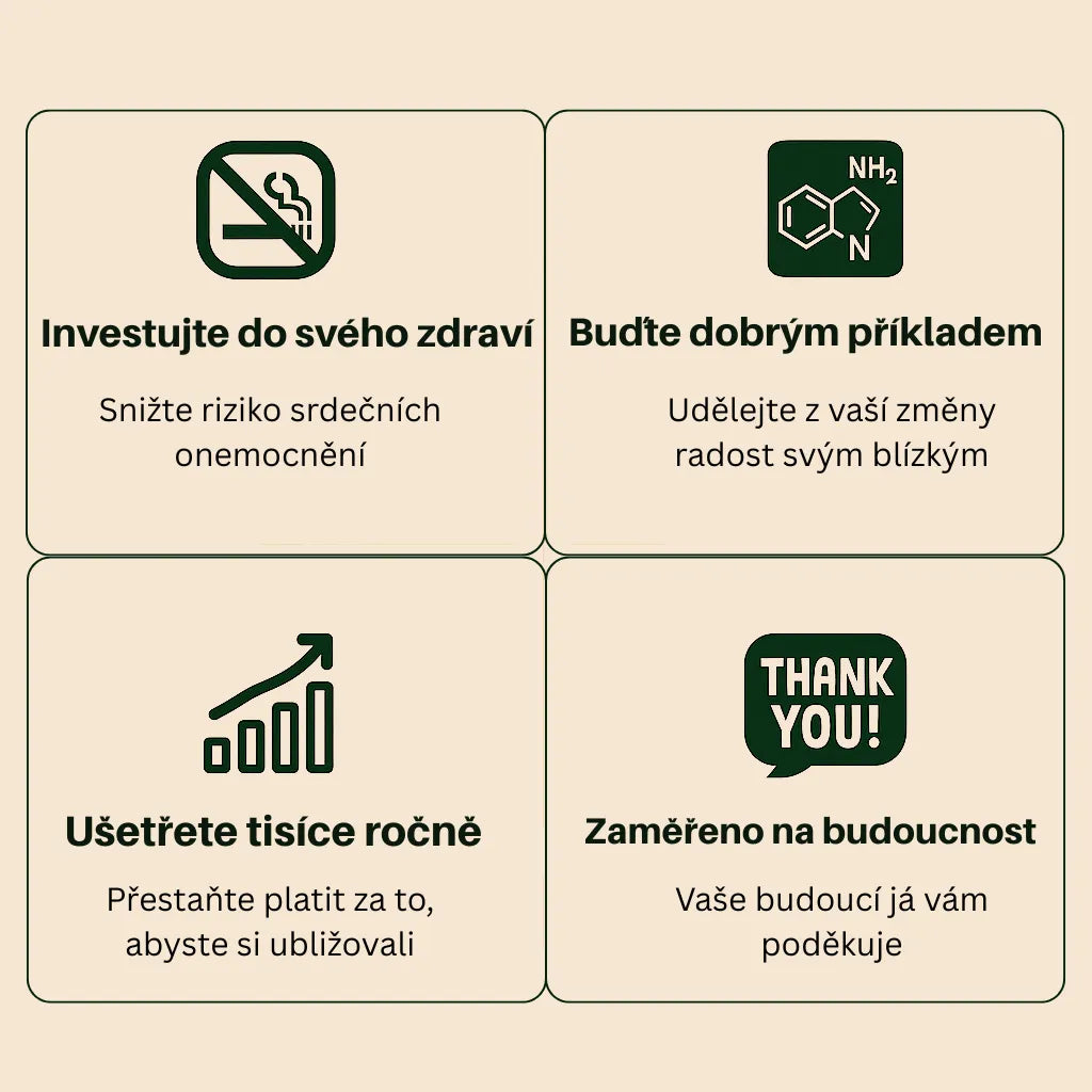 Náplasti, žvýkačky nebo náhlé ukončení často selhávají, protože neřeší rituál, na který je váš mozek zvyklý. Náhrdelník Nuvana™ Stop Smoke nabízí jiný přístup. Váš mozek je instinktivně spojen s pohybem ruky k ústům, a proto jsou abstinenční příznaky tak silné, když se tento zvyk přeruší.