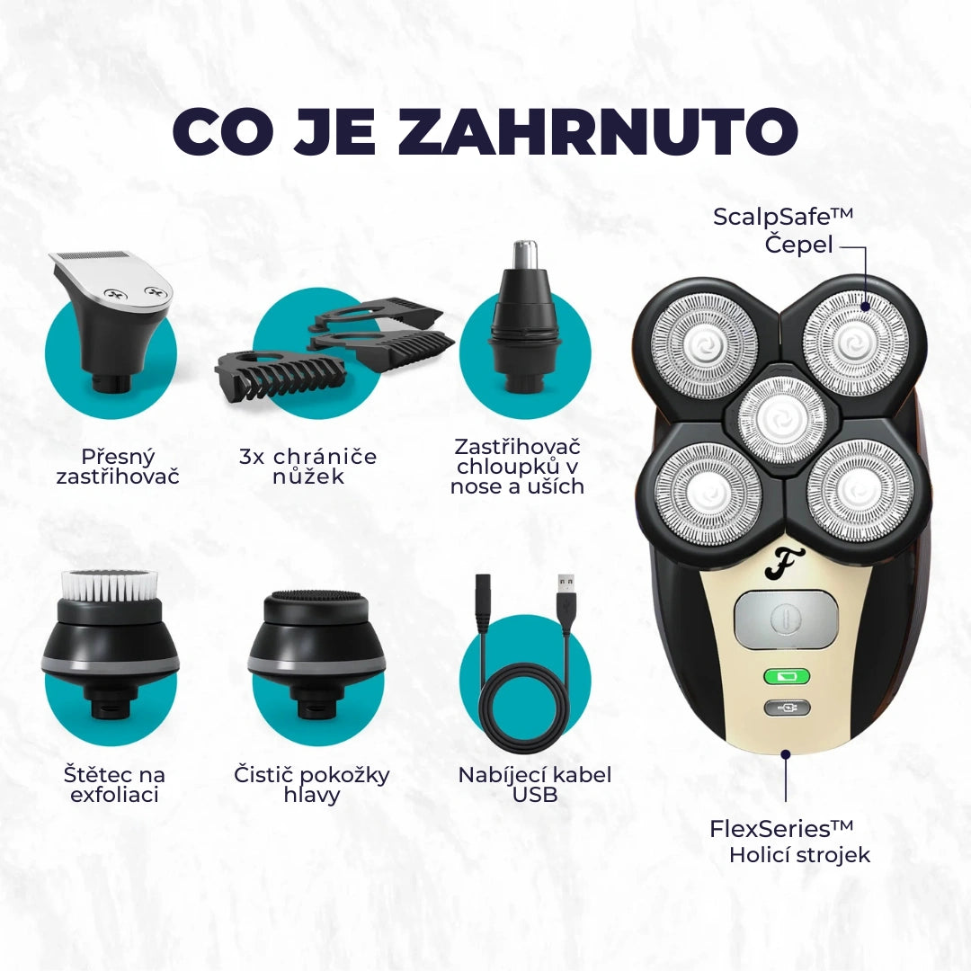Obsahuje holicí strojek s nástavci, zastřihovač na nos a uši, exfoliační kartáček a čistič vlasů pro kompletní péči.