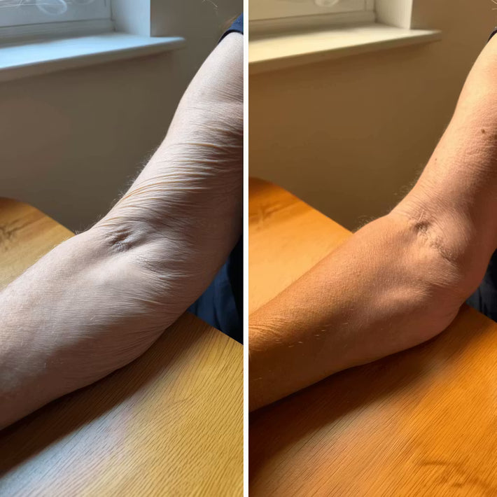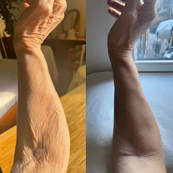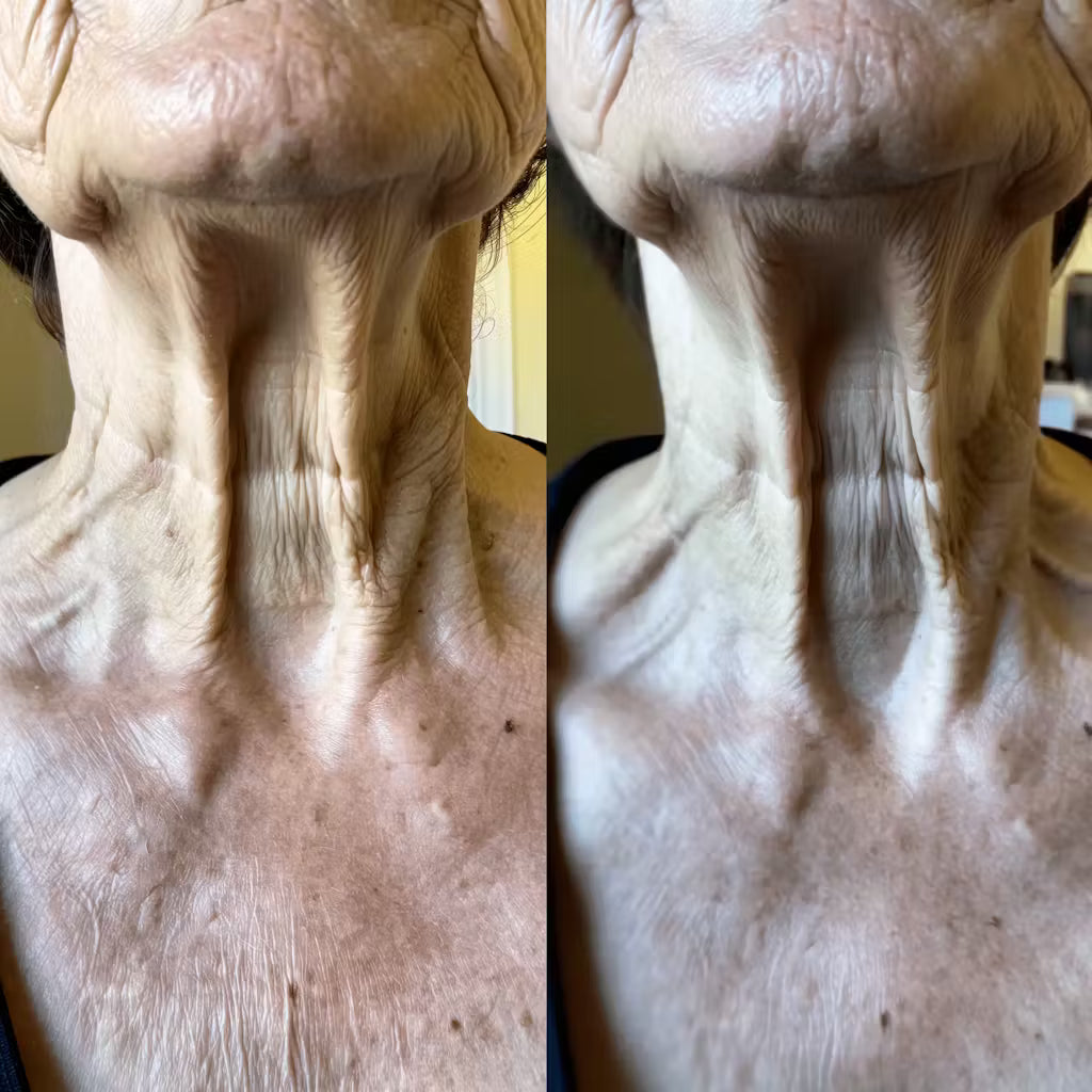 Byl zaznamenán viditelně hladší vzhled pokožky na rukou a krku, zejména kolem loktů a dekoltu.